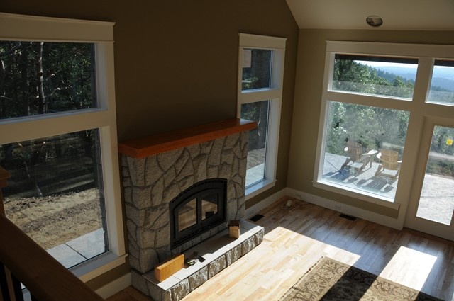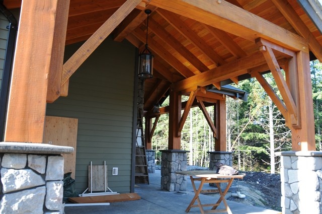 Custom home built on an acreage featuring a large timberwork entry and stone pillars.