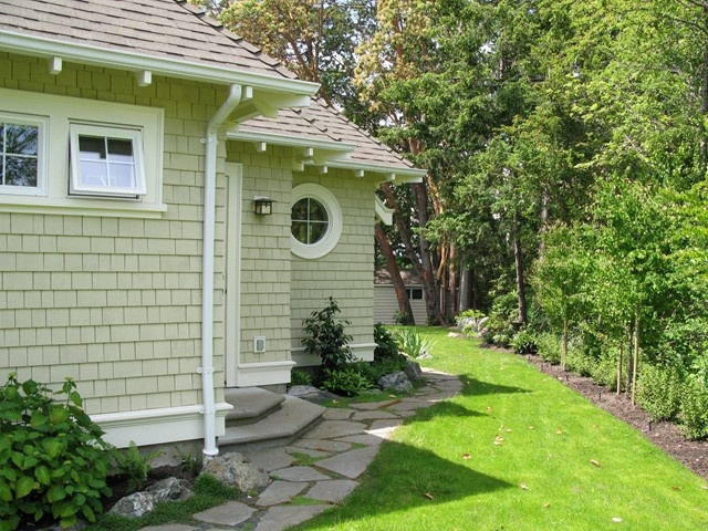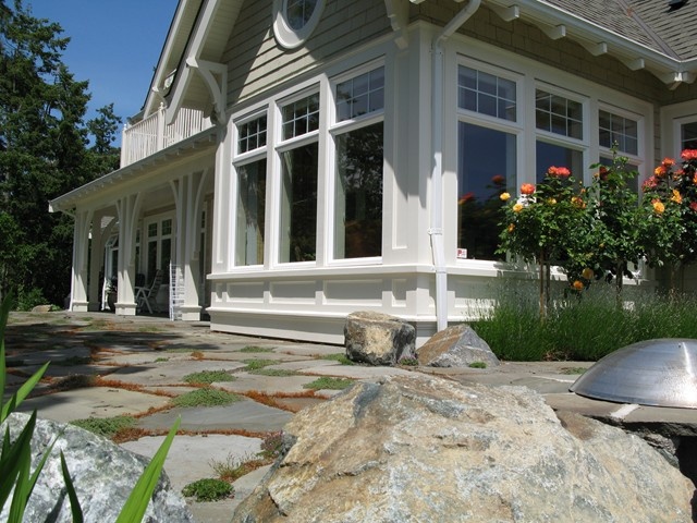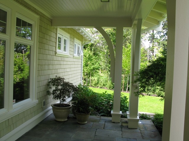 Custom knee brackets (braces) are featured in many ways from the entry to roofline of this ‘oceanfront’ home.
